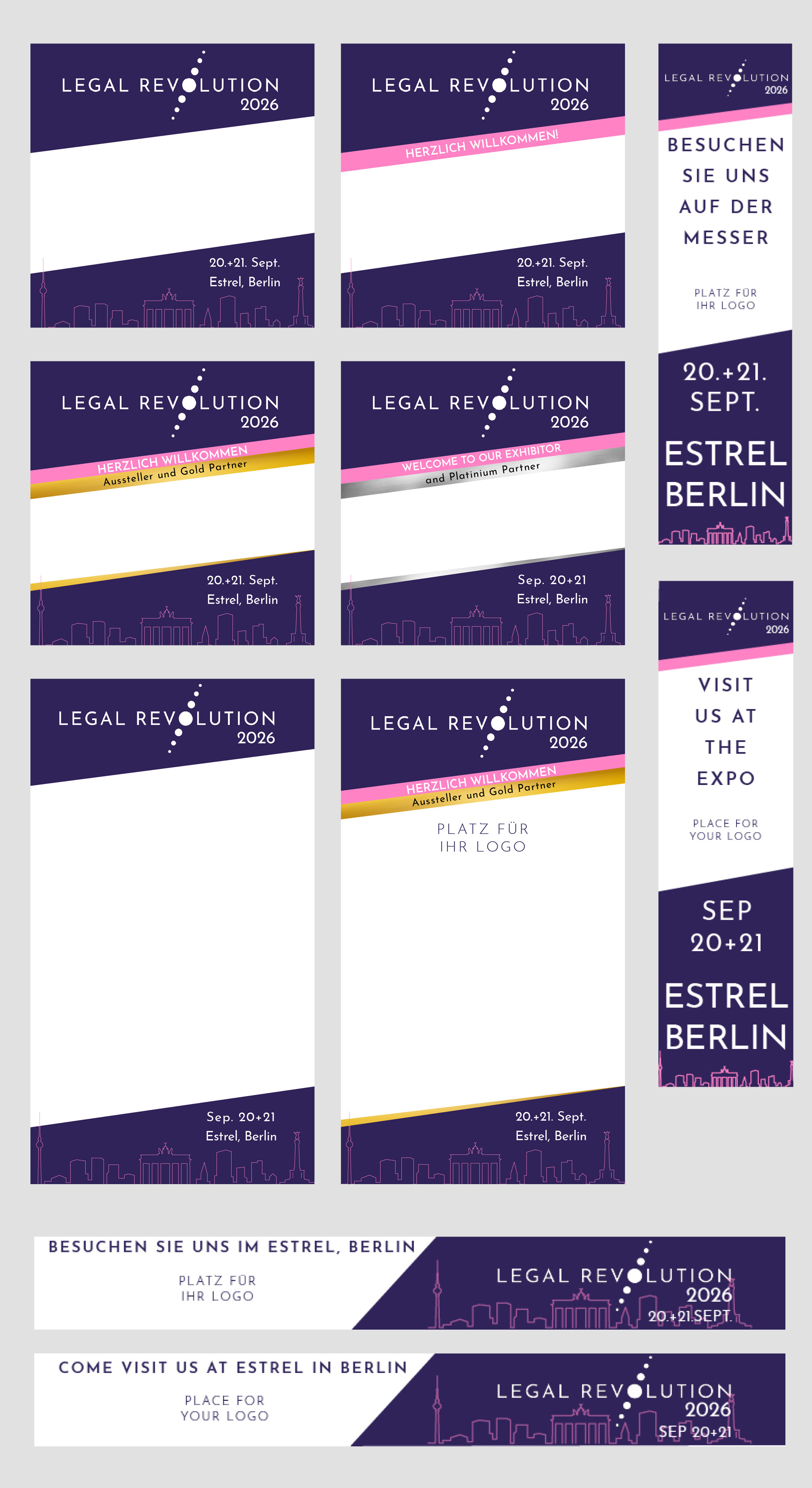 The communication and marketing kits contain banners, badges and logos in German and English that you can use for your social media posts, website, emails, print materials and more to promote your trade-fair presence, your presentation or your participation in LEGAL REVOLUTION 2026.